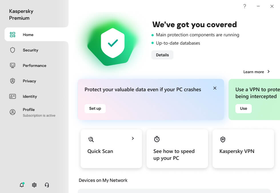 Kaspersky Premium là sự lựa chọn tuyệt vời cho mọi người nhờ giao diện đơn giản và thân thiện với người dùng. Phần mềm này không yêu cầu kỹ năng công nghệ tiên tiến để cài đặt hoặc sử dụng. Chỉ với một vài cú nhấp chuột, bạn có thể bảo mật và bảo vệ thiết bị của mình.